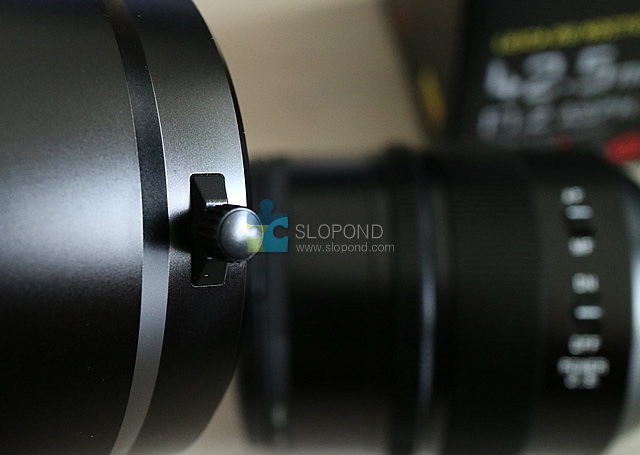 レンズフードは締めるタイプ。アルミ削り出しで手触りがよく高級感が段違い。このレンズフードだけで12,600円するそうです。